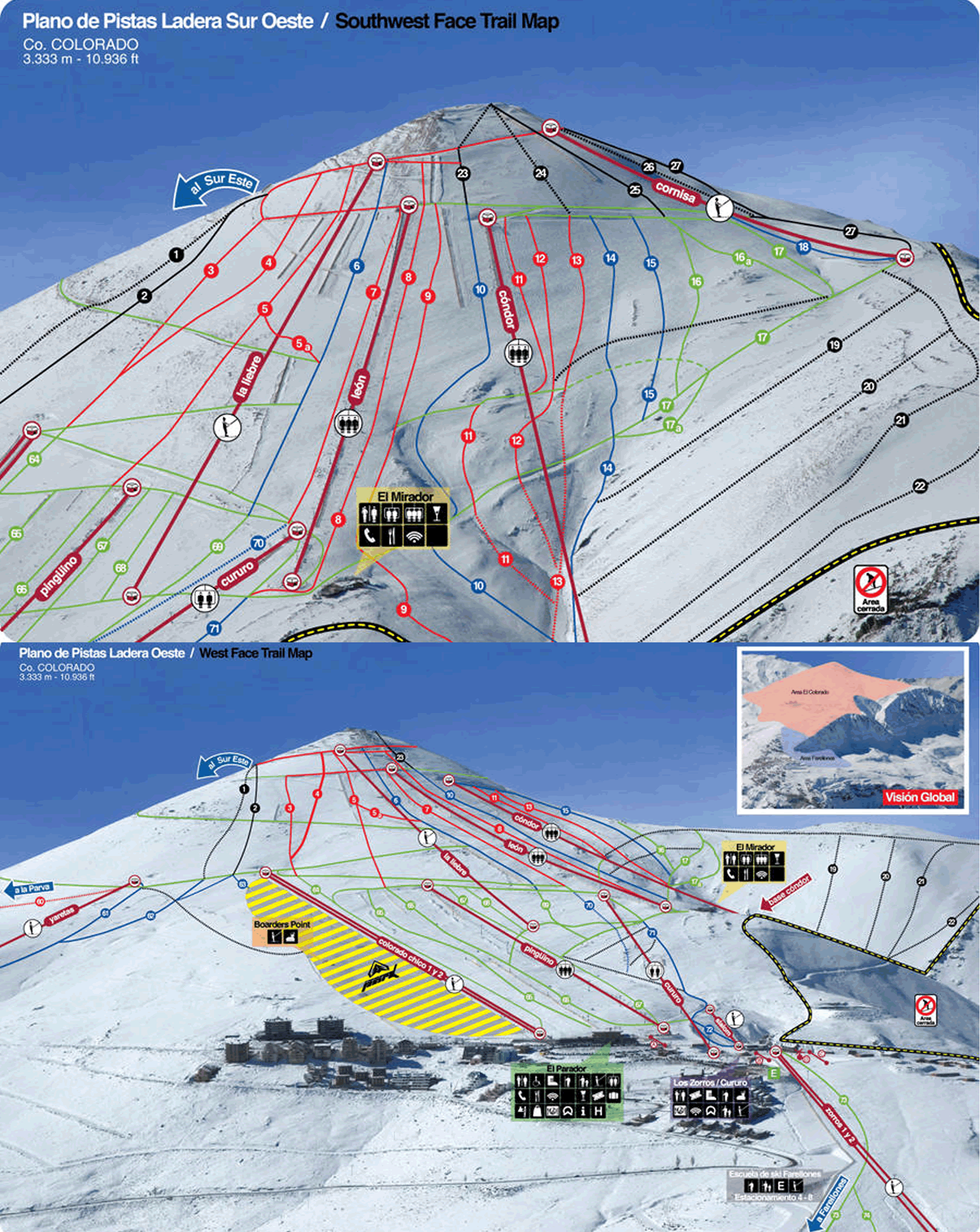 Together with El Colorado and Valle Nevado, it is the largest skiable surface in South America. El Colorado offers 38 kilometers distributed into 30 long and varied runs that may interconnect with the Nevado runs by means of a special ticket.